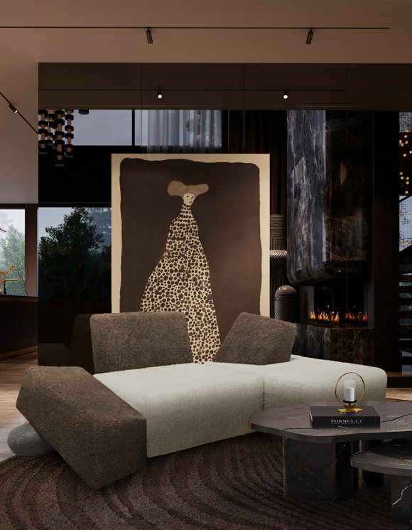 PTANG STUDIOSarsen stones are sandstone blocks that may be found in large quantities in the United Kingdom. These are the stones used in the ancient and enigmatic Stonehenge. This modular two-seater sofa combines two remarkable upholstered cushions, both for the seat and backrest, and is heavily inspired by the arrangement of the stones in the monument. A superb textured single tone boucle upholstery, characterized by its detailed stitching. Using textiles with colors that imitate stones and a clean and streamlined design for a modern and minimalistic appeal. Finally, the design comes to fruition with a small ceramic stone, adding a one-of-a-kind and luxurious touch.